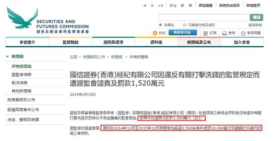 香港證監(jiān)會18日發(fā)布消息稱,國信證券(香港)經(jīng)紀有限公司因違反有關(guān)打擊洗錢的監(jiān)管規(guī)定,遭香港證監(jiān)會譴責及罰款1520萬港元。