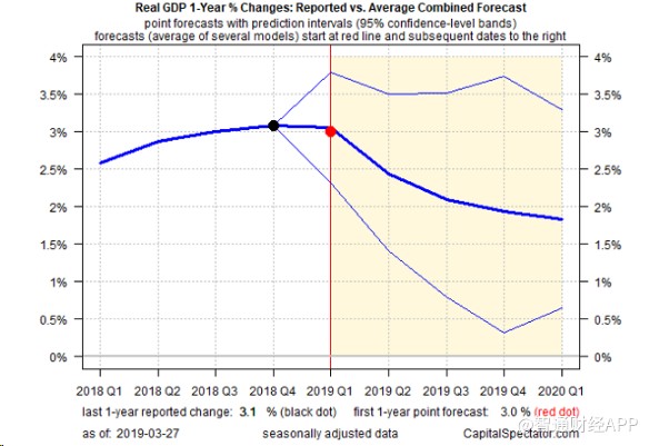 每季度更新的GDP同比數(shù)據(jù)趨勢(shì)也表明,美國(guó)經(jīng)濟(jì)出現(xiàn)下滑?!顿Y本觀察家》通過一系列綜合預(yù)測(cè)得出的平均預(yù)測(cè)值顯示,今年第一季度的同比增幅將從去年第四季度的3.1%小幅降至3.0%,并在未來(lái)幾個(gè)季度繼續(xù)走軟。如果預(yù)測(cè)無(wú)誤,這一同比增幅將出現(xiàn)自2016年第二季度以來(lái)的首次下降。