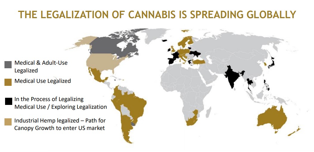 下圖是全球最大的工業(yè)大麻生產(chǎn)商CANOPY GROWTH披露的全球大麻推廣情況圖,從中可以很清晰的看到這一新興行業(yè)政策解禁的進(jìn)程,而且基本可以確定的是,未來灰色的區(qū)域會越來越少。