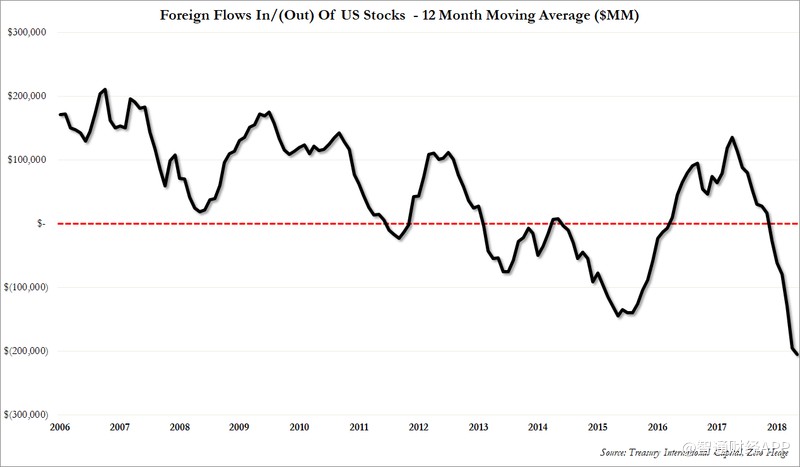 在過(guò)去的12個(gè)月里,外國(guó)投資者總共拋售了了2050億美元的美國(guó)公司股票,這是有記錄以來(lái)外國(guó)投資者對(duì)美股進(jìn)行的最大規(guī)模的減倉(cāng)。(林雅蕓)