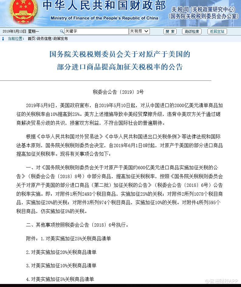 根據(jù)《中華人民共和國對外貿(mào)易法》《中華人民共和國進出口關(guān)稅條例》等法律法規(guī)和國際法基本原則,國務(wù)院關(guān)稅稅則委員會決定,自2019年6月1日0時起,對原產(chǎn)于美國的部分進口商品提高加征關(guān)稅稅率?,F(xiàn)將有關(guān)事項公告如下: