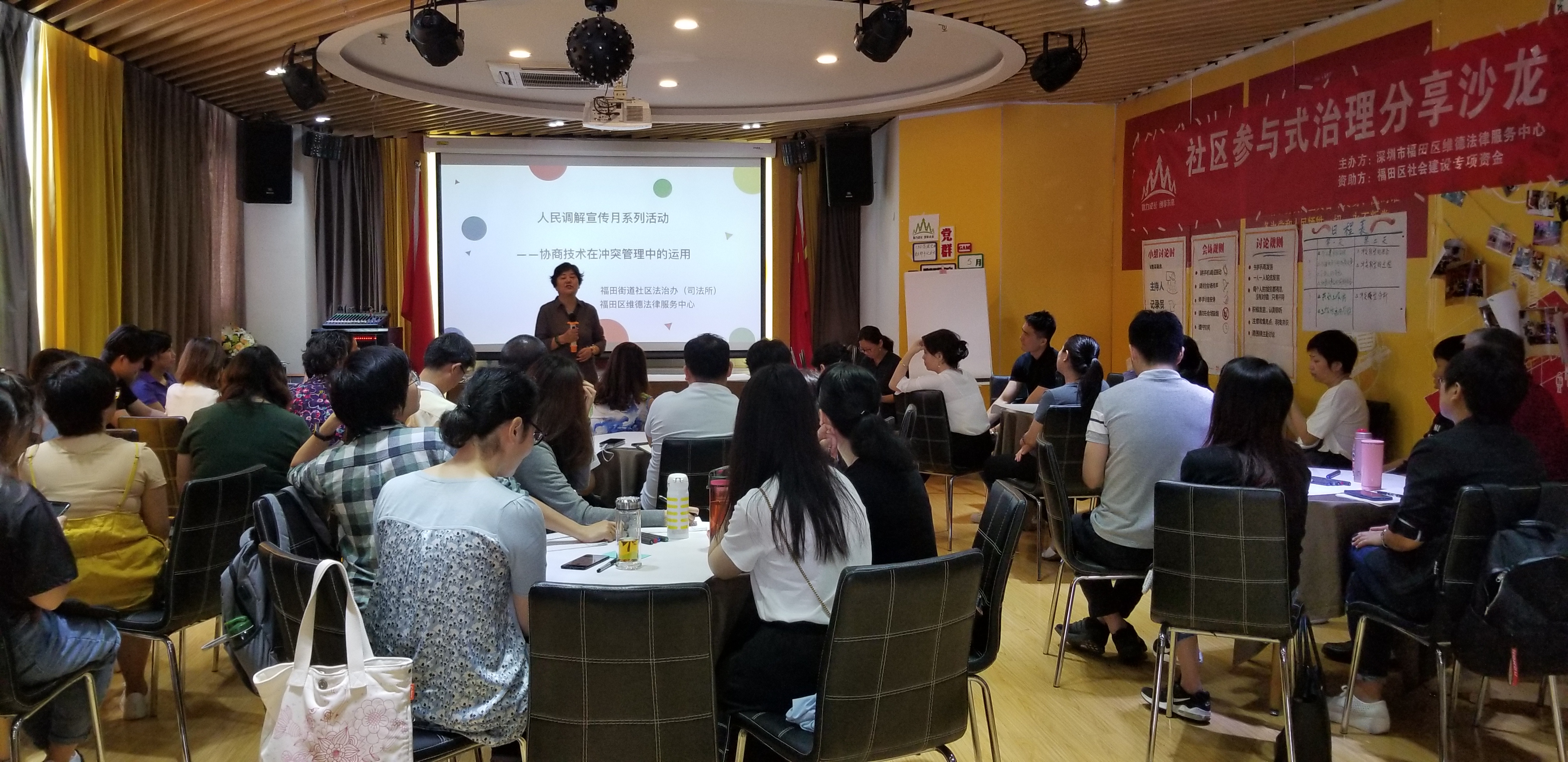 5月15-16日,由“福田區(qū)社會建設(shè)專項資金”資助的社區(qū)議事能力建設(shè)項目在福田區(qū)福田街道“白領(lǐng)e家”開展,來自福田區(qū)各個社區(qū)的人民調(diào)解員、社區(qū)法律顧問、社會工作者以及深圳市福田區(qū)維德法律服務(wù)中心邀請的志愿律師等80余人次參與了本次“社區(qū)參與式治理分享沙龍”。福田區(qū)街道黨委副書記、人大工委主任劉原鑣、深圳市福田區(qū)維德法律服務(wù)中心執(zhí)行主任李嚴出席了分享沙龍啟動儀式。