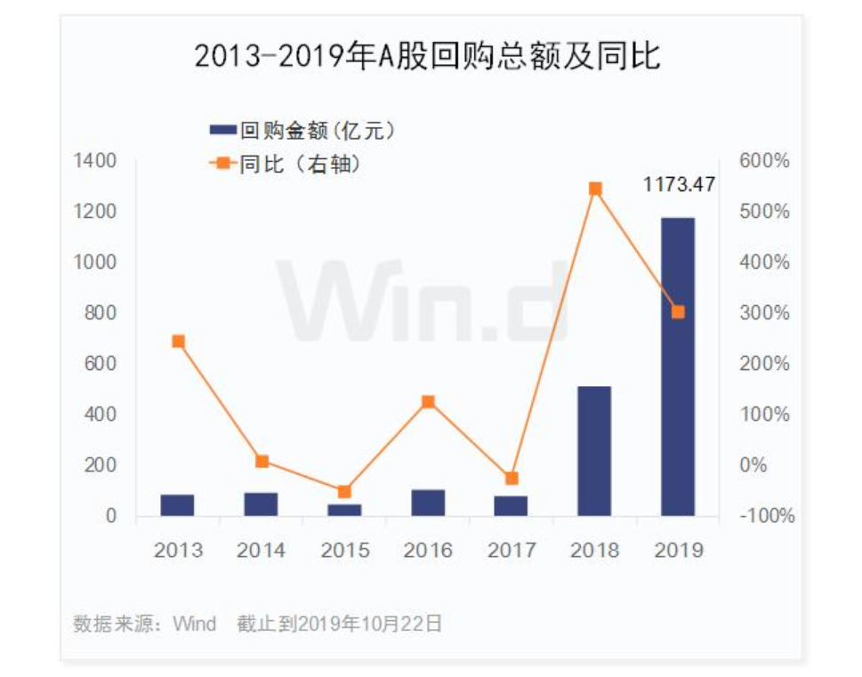 2、A股回購數(shù)量和金額呈爆發(fā)式增長:截止10月22日,2019年兩市已有974家公司實施了1397筆回購,總回購金額已達(dá)1173.47億元,較去年同期增幅超過3倍。