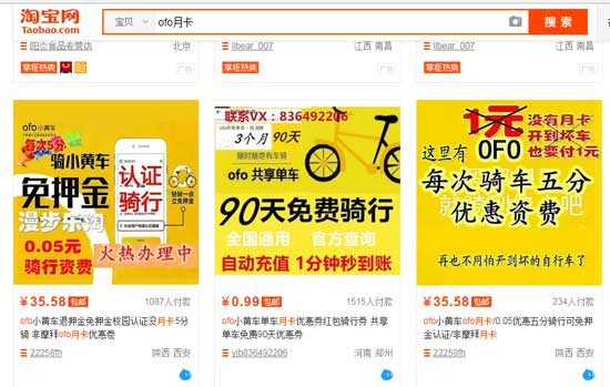 人民網IT頻道記者在調查中發(fā)現(xiàn),在摩拜和ofo的月卡漲價5-10倍的同時,兩家公司大量的高折扣優(yōu)惠卡卻轉移到淘寶等電商平臺公開出售,在淘寶上輸入“摩拜月卡”、“ofo月卡”則出現(xiàn)了大批免押金、8.8元包月、9.99元包月、0.05元騎行資費的廣告,這些高折扣的優(yōu)惠卡從何而來,卻是一個謎。