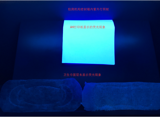 下圖為含有熒光增白物質(zhì)的紙張與衛(wèi)生巾樣品測試對比圖