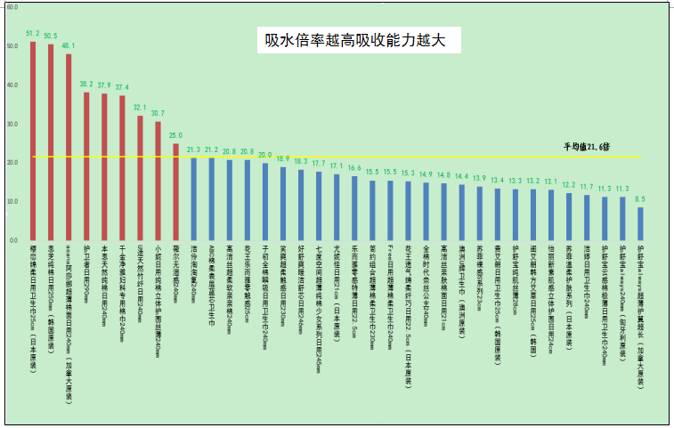 測試結(jié)果顯示,35款衛(wèi)生巾樣品吸水倍率最高達(dá)到51.2倍(櫻戀綿柔日用衛(wèi)生巾,日本原裝),最低為8.5倍(護(hù)舒寶always超薄護(hù)翼超長,加拿大原裝)。對于需要解決經(jīng)期量多量大問題的女性消費(fèi)者可以優(yōu)先選擇吸水倍率高的衛(wèi)生巾商品。無論選擇哪種吸量衛(wèi)生巾,婦幼保健醫(yī)生建議,衛(wèi)生巾最佳更換時間為2-3小時。測試結(jié)果詳見下圖。