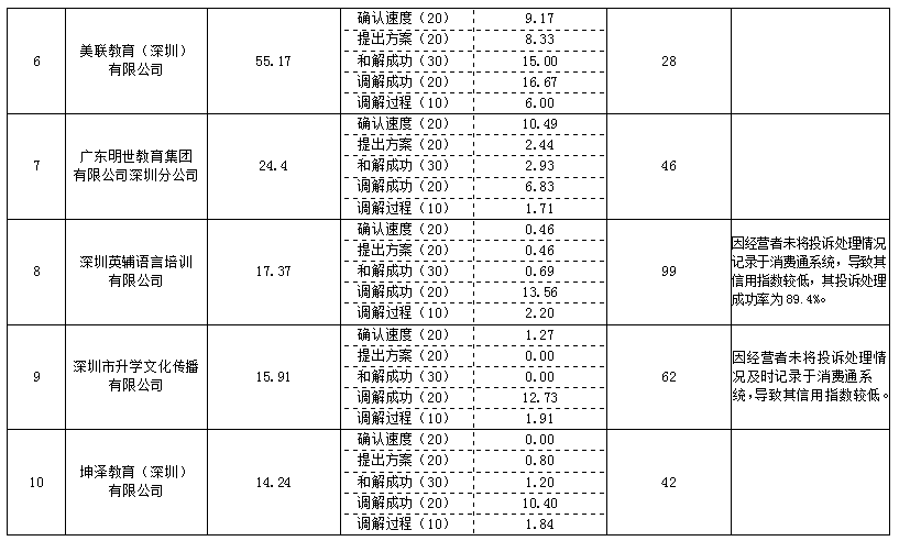 在本次公布的教育培訓行業(yè)消費維權信用指數(shù)排名中,深圳市明德盛世教育科技有限公司的消費維權信用指數(shù)為76.25,排名第一,其2017年4月1日至2018年3月31日期間的投訴量為31宗;坤澤教育(深圳)有限公司的消費維權信用指數(shù)為14.24,排名第十,其2017年4月1日至2018年3月31日期間的投訴量為42宗。
