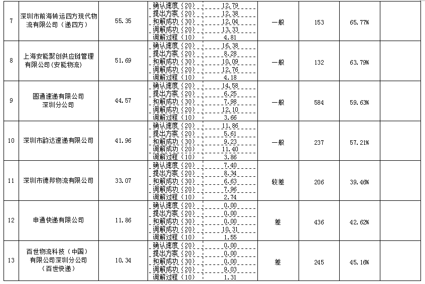 據(jù)市消委會(huì)數(shù)據(jù)顯示,深圳市快遞物流行業(yè)消費(fèi)維權(quán)信用指數(shù)排名前三的企業(yè)分別是:中國(guó)郵政速遞物流股份有限公司深圳分公司,消費(fèi)維權(quán)信用指數(shù)89.17,信用等級(jí)優(yōu)秀;深圳海帶寶網(wǎng)絡(luò)科技有限公司,消費(fèi)維權(quán)信用指數(shù)80.10,信用等級(jí)優(yōu)秀;順豐速運(yùn)有限公司,消費(fèi)維權(quán)信用指數(shù)72.55,信用等級(jí)良好。本次排名靠后的企業(yè)是:深圳市德邦物流有限公司,消費(fèi)維權(quán)信用指數(shù)33.07,信用等級(jí)較差;申通快遞有限公司,消費(fèi)維權(quán)信用指數(shù)11.86,信用等級(jí)差;百世物流科技(中國(guó))有限公司深圳分公司,消費(fèi)維權(quán)信用指數(shù)10.34,信用等級(jí)差,排名最后。