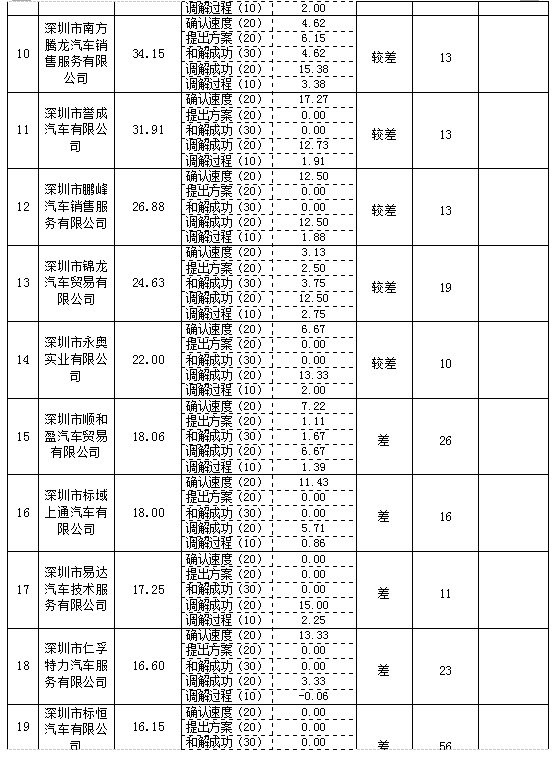 在細(xì)分指標(biāo)方面,深圳市標(biāo)域汽車有限公司、深圳標(biāo)特汽車(集團(tuán))有限公司和深圳市宏創(chuàng)陸風(fēng)汽車銷售有限公司等27家企業(yè)處理投訴不及時(shí),未積極與消費(fèi)者先行和解,導(dǎo)致其企業(yè)“確認(rèn)速度”、“提出方案”和“和解成功”三項(xiàng)分項(xiàng)指標(biāo)的分?jǐn)?shù)皆為0,嚴(yán)重影響了企業(yè)的消費(fèi)維權(quán)信用指數(shù)和信用等級(jí)。深圳市仁孚特力汽車服務(wù)有限公司、深圳市安進(jìn)汽車貿(mào)易有限公司和深圳市大興寶譽(yù)汽車銷售服務(wù)有限公司在由消委會(huì)工作人員評(píng)分的“調(diào)解過(guò)程”分項(xiàng)指標(biāo)分?jǐn)?shù)為負(fù)分,3家企業(yè)存在不配合調(diào)解甚至拒絕調(diào)解的情況,解決消費(fèi)糾紛的誠(chéng)意度較差;另外,深圳市宏創(chuàng)陸風(fēng)汽車銷售有限公司的消費(fèi)維權(quán)信用指數(shù)為0,誠(chéng)意度和滿意度為0,10宗消費(fèi)投訴皆未處理成功,排名最后。