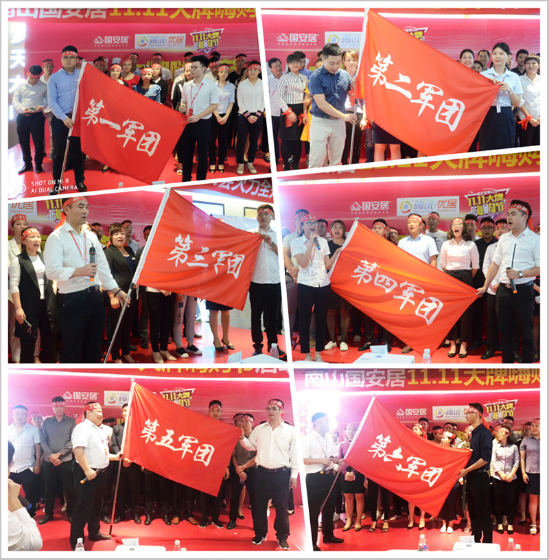 隨后,來自南山店全體方陣隊員高舉隊旗,高喊口號,將現(xiàn)場氣氛推向高潮,品牌代表們紛紛上臺發(fā)言,幾百家建材家具品牌以第一軍團、第二軍團、第三軍團、第四軍團、等等團隊方陣,登場亮相,高呼團隊口號,并且當場簽署了“雙11大促”的軍令狀,并從商場負責人手中接過了“雙11大促”的軍旗,這將預示著“國安居南山店&騰訊優(yōu)居雙11大牌嗨購節(jié)”定將以卓越的佳績,創(chuàng)造新一輪的銷售盛況!