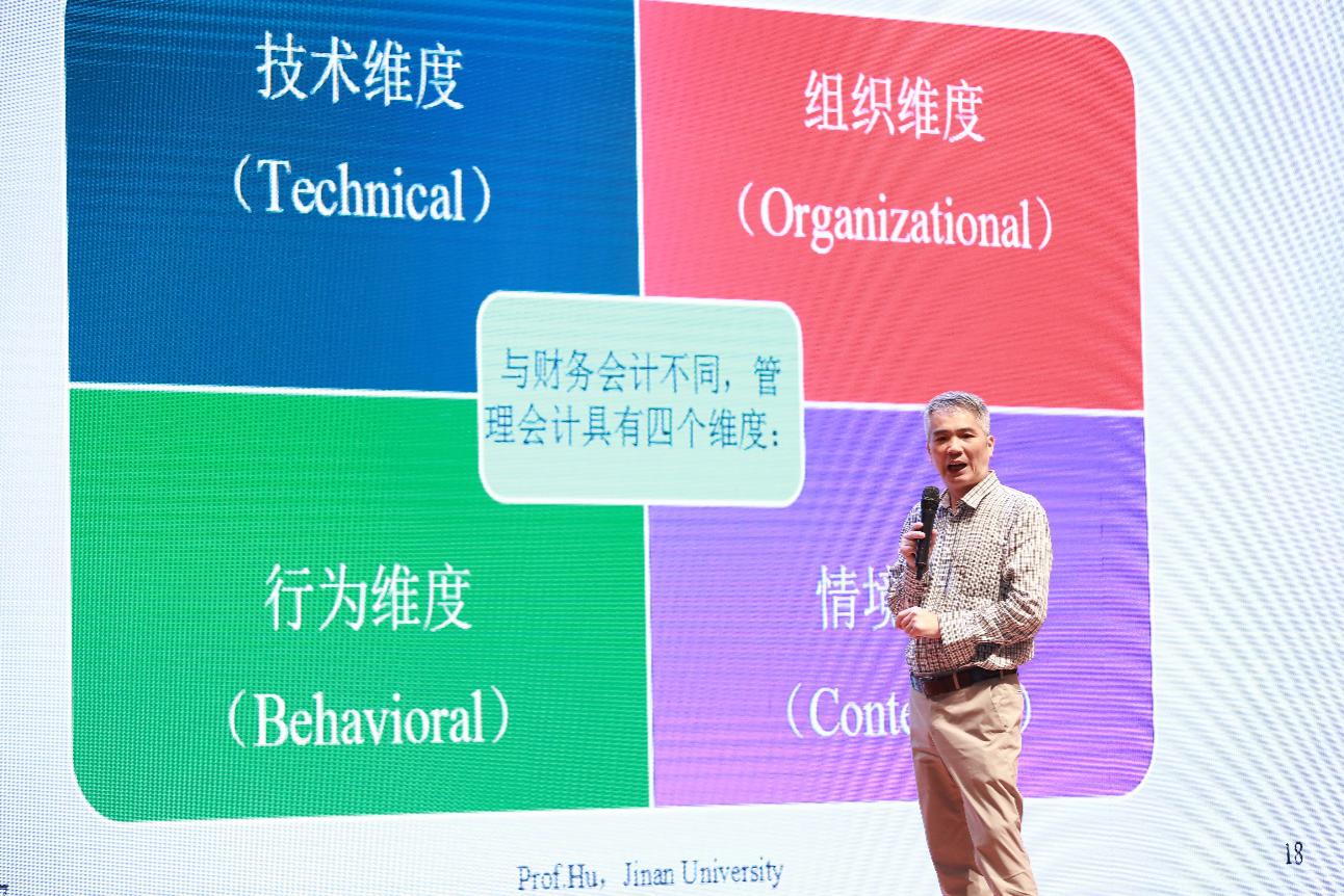 下午,暨南大學會計系教授胡玉明以“管理會計如何‘由技入道’”為題,首先分析了管理會計與財務會計有何不同,并深入淺出的剖析了大智移云背景下,管理會計的提升關鍵在于分析對數(shù)字背后意義。他強調,會計人員對大數(shù)據(jù)等新科技挑戰(zhàn)不應當恐慌,反而應當成機遇,提升數(shù)據(jù)分析能力。