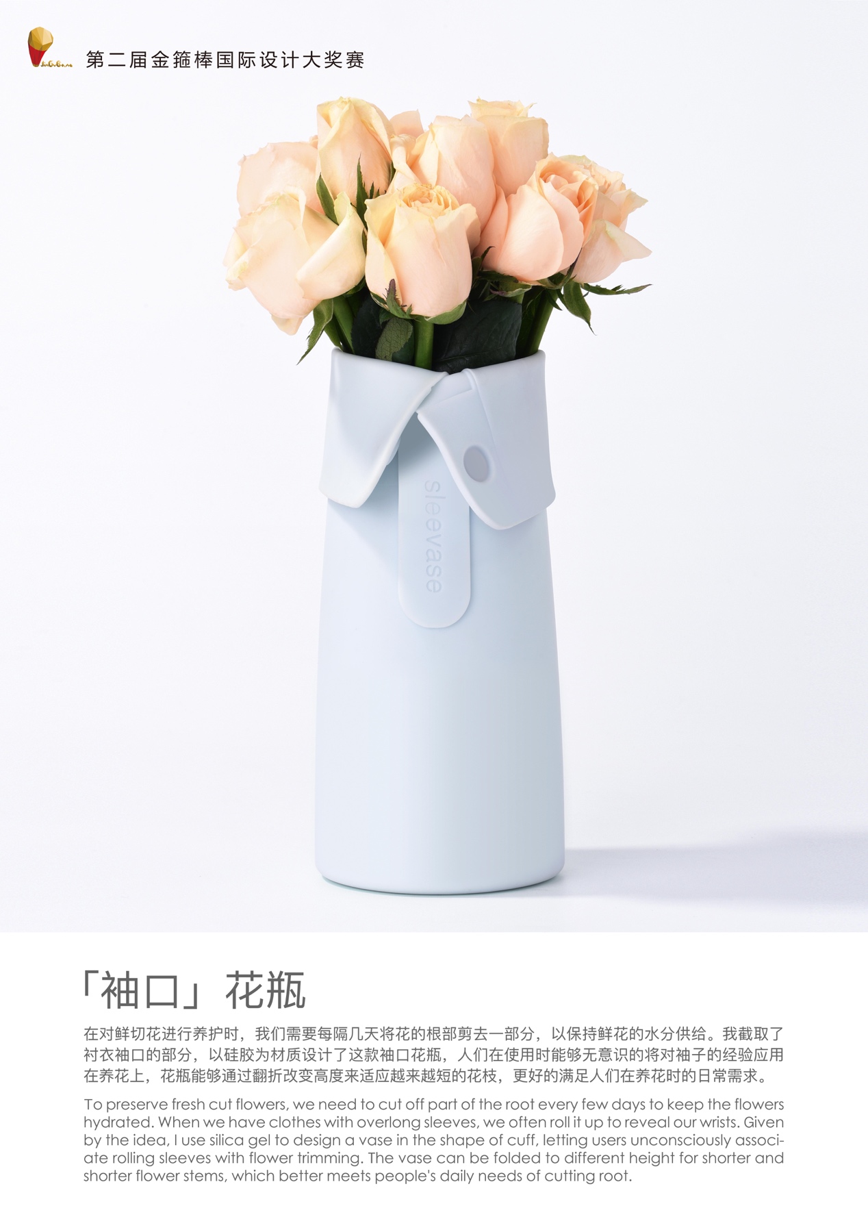 這件作品將衣袖造型應(yīng)用于植物養(yǎng)護(hù),用戶可以通過翻折來改變花瓶高度,從而適應(yīng)不同長短的花枝。設(shè)計(jì)師抓住了人們?nèi)粘I钪蟹浅<?xì)微的一個痛點(diǎn),進(jìn)行了大膽的設(shè)計(jì),作品本身簡約且意趣盎然,同時具有很強(qiáng)的產(chǎn)業(yè)化可行性,因而也獲得了評委們的芳心。