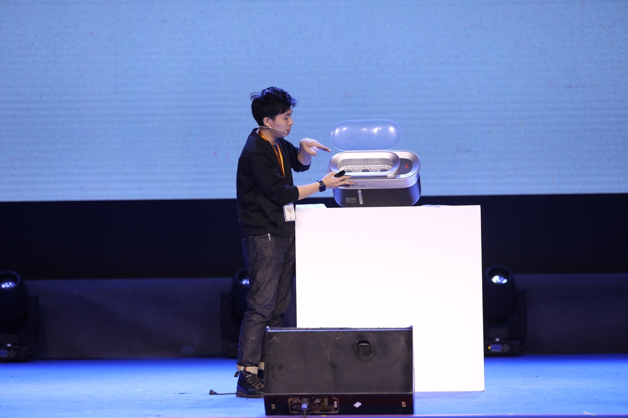 10件作品的設(shè)計(jì)師全部完成作品答辯后,7位評委進(jìn)入評審室進(jìn)行統(tǒng)計(jì)結(jié)果復(fù)議。在此期間,首屆金箍棒國際設(shè)計(jì)大獎賽金獎得主賈鵬,以及金箍棒工業(yè)產(chǎn)品設(shè)計(jì)江陰有限公司運(yùn)營總監(jiān)何田鑫分別上臺,為現(xiàn)場觀眾帶來產(chǎn)品設(shè)計(jì)和創(chuàng)業(yè)理念方面的分享,獲得了現(xiàn)場的陣陣掌聲。