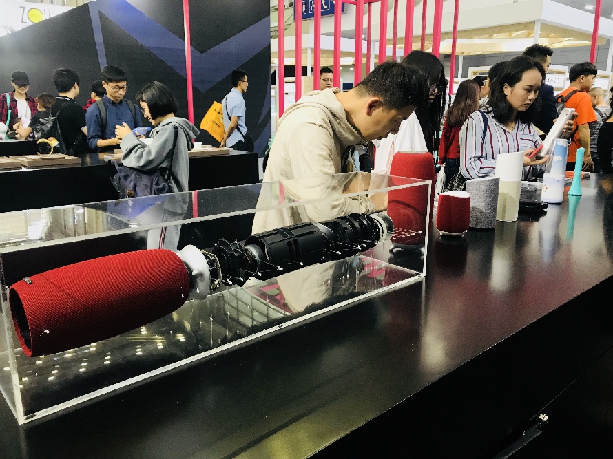 現(xiàn)場展出的小雅AI音箱是國內首款全內容智能音箱,是洛可可為喜馬拉雅所設計。設計過程中的眾創(chuàng)環(huán)節(jié)覆蓋了37.5萬用戶,2.5萬用戶直接參與。洛可可助力喜馬拉雅將內容載體從APP“搬到了”產品中,拉開了國內音箱創(chuàng)新變革的帷幕。而現(xiàn)場展出的曉雅mini AI音箱則是迭新之作,產品的底部使用穩(wěn)定的三腳支撐設計,減小與桌面的接觸面積,有效避免共振現(xiàn)象引起的音質受損。