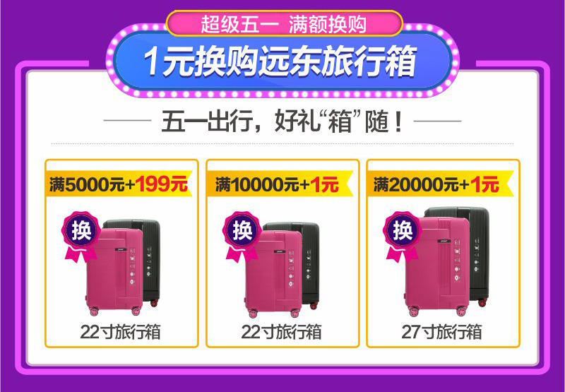 5、1元換購FAREAST旅行箱:活動期間,顧客凡在店內(nèi)下定實付(多個訂單可累積)滿5000元可加199元換購22寸 FAREAST旅行箱;滿10000元可加一元換購22寸 FAREAST旅行箱,滿20000元加一元換購27寸FAREAST旅行箱,送完即止。