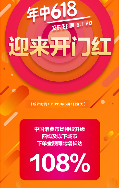 深圳新聞網(wǎng)2019年6月3日訊 6月1日零時(shí)剛過(guò),京東后臺(tái)銷售數(shù)據(jù)顯示訂單量就呈現(xiàn)出井噴狀態(tài),一年一度的京東618全球年中購(gòu)物節(jié)正式開(kāi)啟。京東大數(shù)據(jù)顯示,6月1日全天四線及以下城市下單金額同比增長(zhǎng)達(dá)108 %。