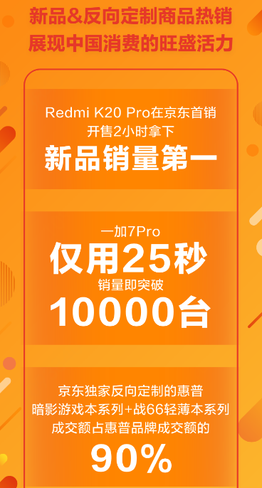 Redmi K20 Pro特地選擇在京東618期間首銷,其中還針對(duì)京東的用戶推出了京東獨(dú)家版本,而Redmi K20 Pro的整體銷售成績(jī)也表現(xiàn)不俗,在開(kāi)售2小時(shí)就拿下新品銷量第一;而在京東618期間推出的一加7Pro,僅用了25秒就銷售上萬(wàn)部。