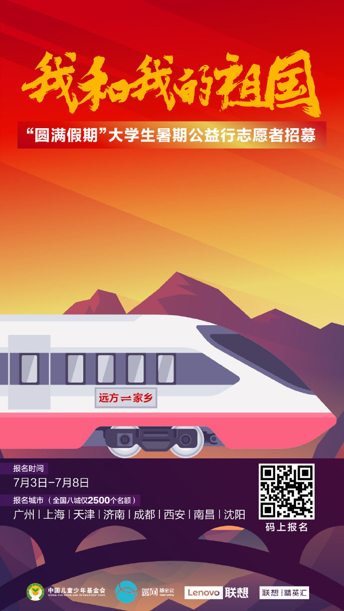 7月3日,由中國(guó)兒童少年基金會(huì)、北京圓網(wǎng)慈善基金會(huì)和聯(lián)想集團(tuán)共同發(fā)起的“‘我和我的祖國(guó)’圓計(jì)劃—圓滿假期大學(xué)生暑期公益行”活動(dòng),面向全國(guó)8個(gè)城市的大學(xué)生正式開(kāi)啟志愿者招募,邀請(qǐng)回鄉(xiāng)大學(xué)生加入到為廣大留守兒童群體量身定制的公益行動(dòng)中,幫孩子團(tuán)圓、為孩子圓夢(mèng)、讓愛(ài)心圓滿。對(duì)于大學(xué)生來(lái)說(shuō),這將是一次獨(dú)特的公益實(shí)踐經(jīng)歷。