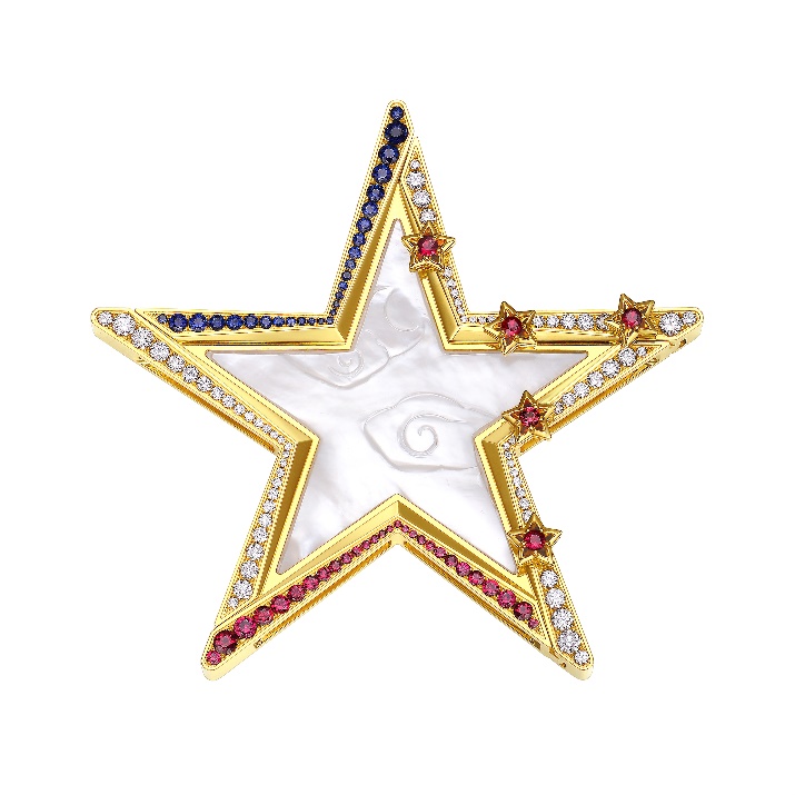 作為本次發(fā)布會(huì)主角,周大福17916系列新品“宸”曾作為第11屆“法國圣埃蒂安國際設(shè)計(jì)雙年展”參展作品,在世界舞臺(tái)上綻放過光芒。“五角星”的造型融入了法國國旗藍(lán)、白、紅三色和中國國旗的五角星元素,代表了中法兩國的交流與合作,雙方希望通過宸這樣意義深遠(yuǎn)的產(chǎn)品,見證和促進(jìn)兩國的和平發(fā)展與經(jīng)濟(jì)交流。“宸”以北極星為靈感來源,寓意點(diǎn)亮年輕人的生活與夢(mèng)想。別具一格的五角星設(shè)計(jì)藝術(shù)感十足,鉆石與22K金的加持,更讓整個(gè)作品展現(xiàn)出奪目光彩。白貝母項(xiàng)鏈外圈圍以鉆石、寶石,一款三戴,幻化無限魅力。簡潔的五角星造型,干凈有力,猶如夜空中指引前行的明星。