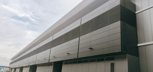不僅如此,項目組在材料種類的選擇上也非??季浚耗粔θ渴褂霉I(yè)級鋁板,硬度比普通幕墻鋁板高15%,除了具備超強的抗變形、抗劃傷、防裂耐蝕能力之外,還能夠在潮濕環(huán)境中保持穩(wěn)定的性能。施工方負責人表示,深圳國際會展中心幕墻鋁板的平整度是普通鋁板的3-4倍,防變形能力則至少是普通材料的2倍。