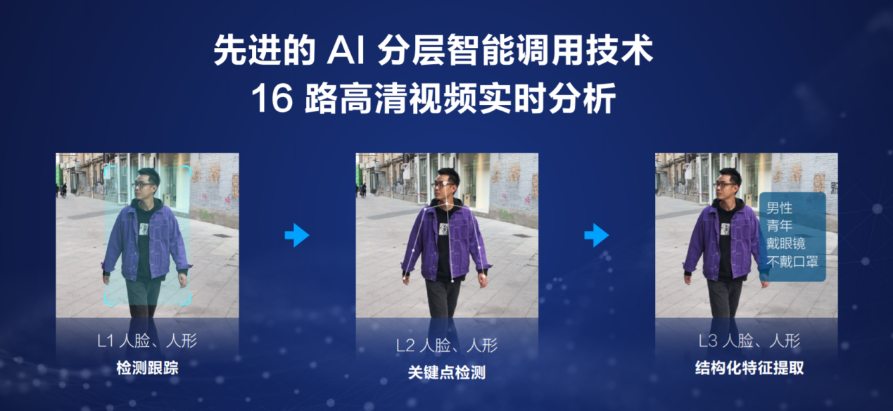 針對邊緣計算的硬件架構特點,360家庭安全大腦·旗艦版設計了邊緣側AI調度引擎,分層智能調用,從人臉人形的基礎檢測跟蹤到關鍵點提取和圖像優(yōu)選再到結構化特征提取比對,層層遞進,最終實現(xiàn)了邊緣側單機16路1080P高清視頻實時解碼分析處理。