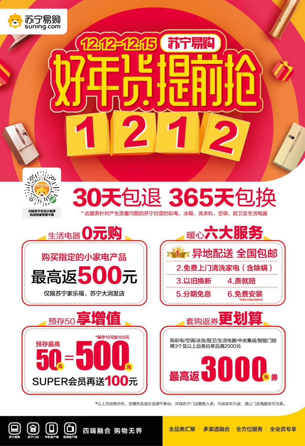 同時,深圳蘇寧還聯(lián)合各大知名品牌為廣大消費者推出了多重超強福利,在活動力度上,預存50元可抵500元的家電購物抵用券,并且套購多個產(chǎn)品最高可返3000元的優(yōu)惠券。除此之外,蘇寧家樂福、蘇寧大潤發(fā)、蘇寧歐尚聯(lián)合推出生活家電0元購活動,消費者購買生活電器可返產(chǎn)品價格的同等金額,最高省500元。并且雙十二當天在蘇鮮生購物使用蘇寧金融支付新用戶滿50元減20元,老用戶滿30元減10元,12月15日在蘇寧小店購物使用翼支付還可享5折立減??梢灶A見,從產(chǎn)品、價格、服務(wù)、活動各個方面不斷提升消費者購物體驗的深圳蘇寧將成為消費者選購年貨的不二選擇。(吳艷)