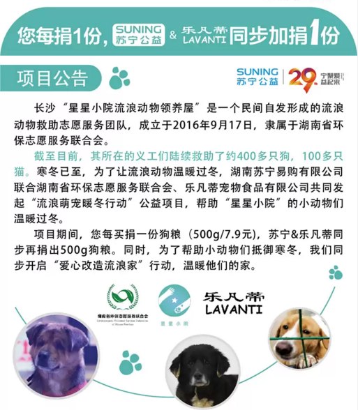 要說本次暖心活動最受關(guān)注的,還屬蘇寧線上線下聯(lián)動發(fā)起的“愛心狗糧7.9元捐”活動。活動期間,愛心人士只需要以7.9元的折扣價,在蘇寧易購線上購買一斤樂凡蒂狗糧就可完成捐贈。同時,蘇寧和樂凡蒂將加捐1斤。相當(dāng)于7.9元捐贈兩斤狗糧。而這些愛心狗糧,將直接發(fā)往長沙“星星小院流浪動物領(lǐng)養(yǎng)屋”。
