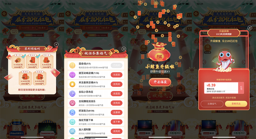 用戶通過(guò)做任務(wù)、每日簽到、逛品牌店鋪,或者訪問(wèn)小蘇的農(nóng)莊、玩賺錢消消樂福利游戲均可獲得福氣值以喂養(yǎng)鯨魚,收集到的福氣值越多,福袋將變得越大,鯨魚升級(jí)也越快,可領(lǐng)取的紅包金額也越大。