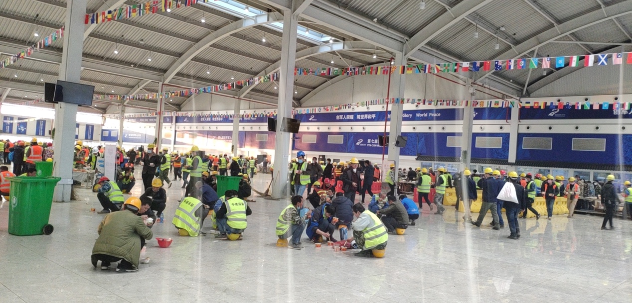 雷神山現(xiàn)場,工人中午就餐