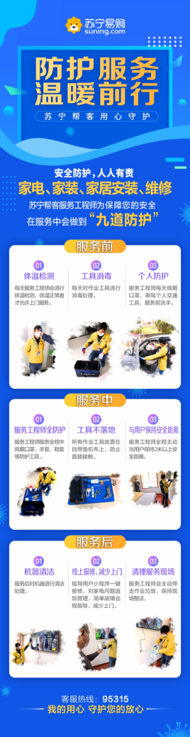 據(jù)悉,蘇寧家電“九道防護(hù)”措施涵蓋服務(wù)的前、中、后期全程。服務(wù)前,蘇寧服務(wù)工程師需進(jìn)行體溫檢測(cè),衣物工具車輛消毒,同時(shí)佩戴口罩;服務(wù)過(guò)程中,需佩戴口罩、手套、鞋套等全套防護(hù)工具,并主動(dòng)與用戶保持2米的安全距離,避免直接接觸;服務(wù)完成后,對(duì)機(jī)器進(jìn)行清潔處理,同時(shí)指導(dǎo)用戶關(guān)注報(bào)修和故障求助,帶走作業(yè)垃圾。