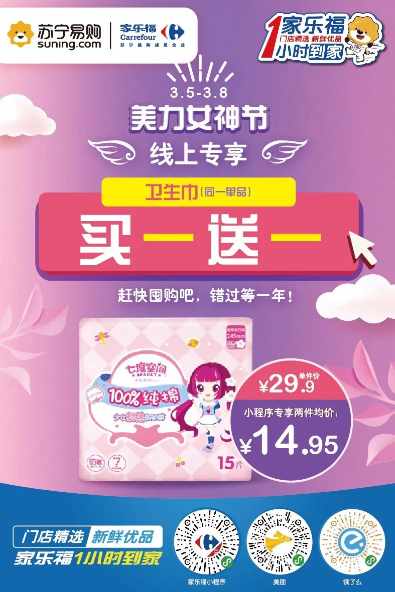當然,家樂福也一直在線,給你們送上儀式感節(jié)日福利。3月5日至3月8日,家樂福美“力”女神節(jié)熱辣來襲。家樂福小程序、蘇寧易購APP、蘇寧小店APP、美團外賣和餓么了五大線上平臺“火力全開”,讓你的美麗一直營業(yè)不打烊。