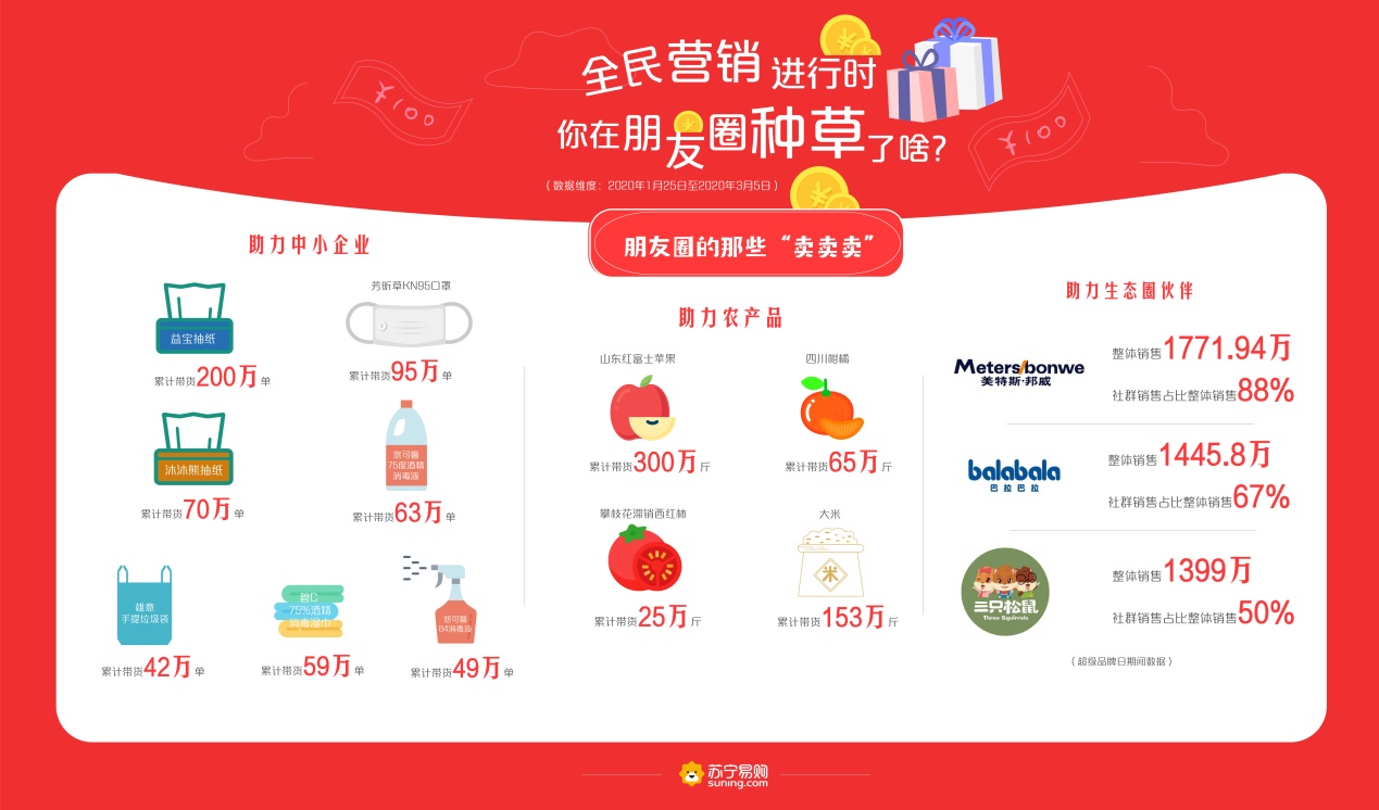 深圳新聞網(wǎng)2020年3月10日訊 線上買菜、線上看病、直播上課、遠(yuǎn)程健身……“宅經(jīng)濟(jì)”爆發(fā),使得社群私域流量積累的能量進(jìn)一步凸顯,全民營(yíng)銷成為新風(fēng)口。近日,蘇寧易購(gòu)發(fā)布全民營(yíng)銷大數(shù)據(jù),2020年1月25日至3月5日,蘇寧推客買家數(shù)和賣家數(shù)分別突破千萬、百萬大關(guān),80后成為朋友圈買、賣“雙主力”,糧油休食、個(gè)護(hù)家清、生鮮等產(chǎn)品成為最受歡迎的消費(fèi)品類。