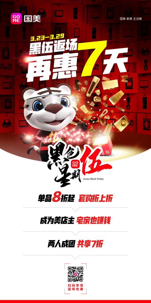 據(jù)了解,3月23日-3月29日,國美零售“黑伍”返場,再惠7天。在此期間,國美多種優(yōu)惠玩法悉數(shù)上線。用戶將不僅享受單品8折起、套購折上折的優(yōu)惠,成為美店主,還能宅家賺錢,享受商品返利。此外,還有兩人成團,共享7折等,快來國美美店廚飲專場選購吧。