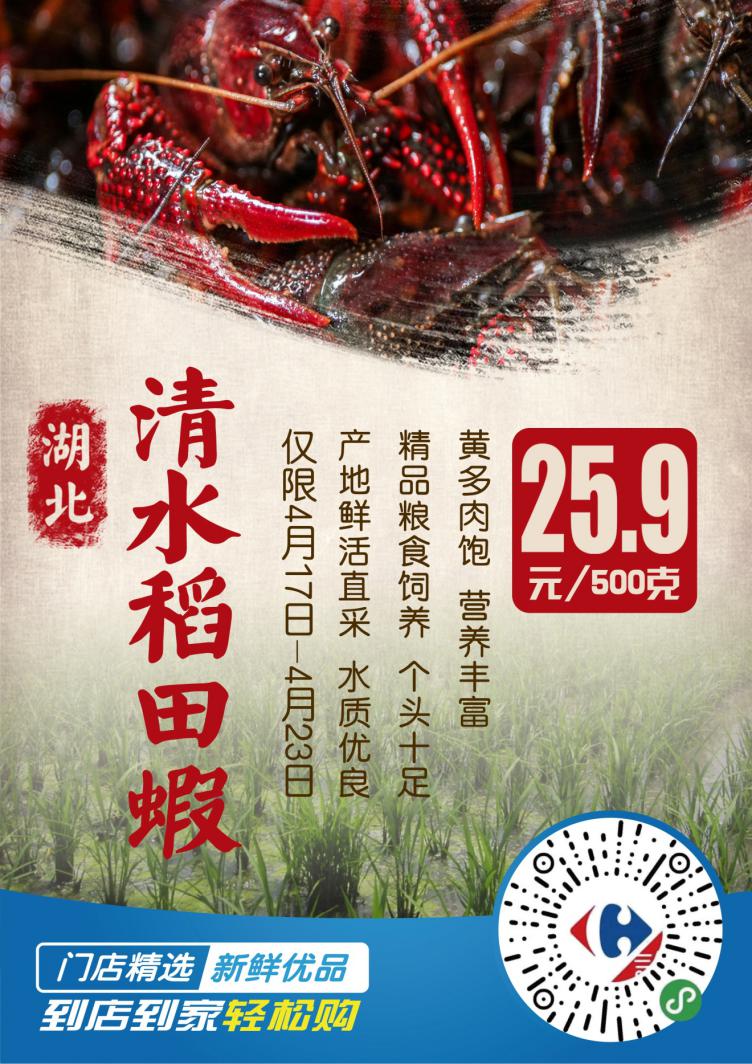 15號開始捕撈的這批湖北“清水稻田蝦”將于16號完成分揀裝車,發(fā)往家樂福全國各地大倉,17號,家樂福位于北京,上海、哈爾濱,長沙,成都,昆明,廣州,深圳等地的155家門店鮮活開售,恰逢家樂福418購物節(jié),嘗鮮價(jià)低到25.9元/500克(僅限4月17日至23日)。同時(shí),顧客還可以通過家樂福小程序、蘇寧易購app、蘇寧小店App、及美團(tuán)、餓了么下單,享受1小時(shí)送到家的極致“鮮“體驗(yàn)。