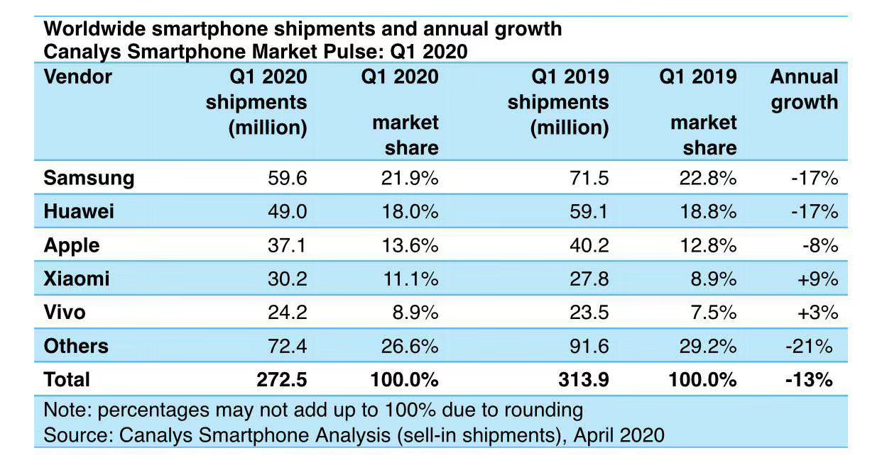 見(jiàn)圳客戶端·深圳新聞網(wǎng)2020年5月6日訊 國(guó)際權(quán)威機(jī)構(gòu)IDC最新報(bào)告顯示,全球智能手機(jī)出貨量在2020年第一季度同比下降11.7%。其中,三星、華為、蘋果依舊穩(wěn)居前三,分別為21.1%、17.8%和13.3%。