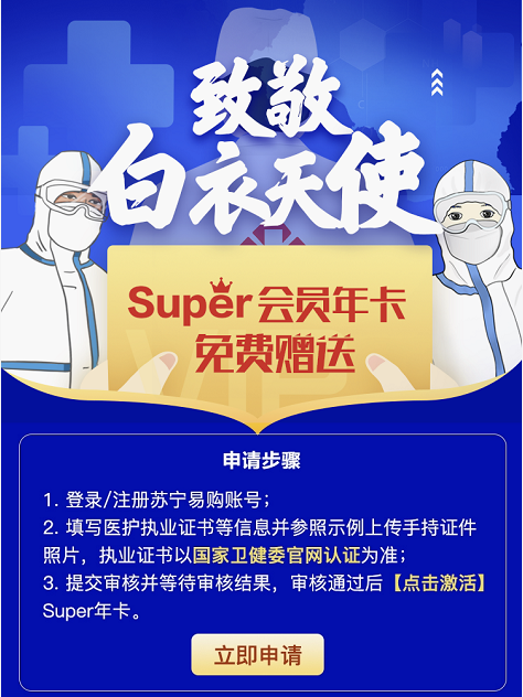 為表達(dá)對(duì)醫(yī)護(hù)工作者的敬意,蘇寧對(duì)全國(guó)醫(yī)護(hù)人員開放SUPER會(huì)員免費(fèi)申領(lǐng)活動(dòng)。