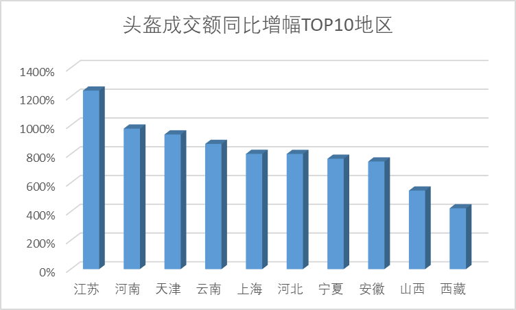 頭盔取得高速增長的同時(shí),摩托車、電動(dòng)車的成交額增幅也分別超過110%和50%。寧夏、北京、甘肅、陜西等地區(qū)摩托車成交額同比增幅較高,而西藏、北京、寧夏、甘肅等地區(qū)的電動(dòng)車成交額同比增幅較高。