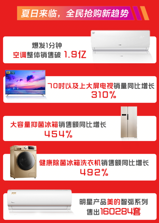 在品類表現(xiàn)上,空調(diào)、冰洗、彩電銷售火熱。爆發(fā)1分鐘,空調(diào)整體銷售破1.9億,明星產(chǎn)品美的智弧系列18小時售出160284套;截至18時,健康除菌冰箱洗衣機銷售額同比增長492%。