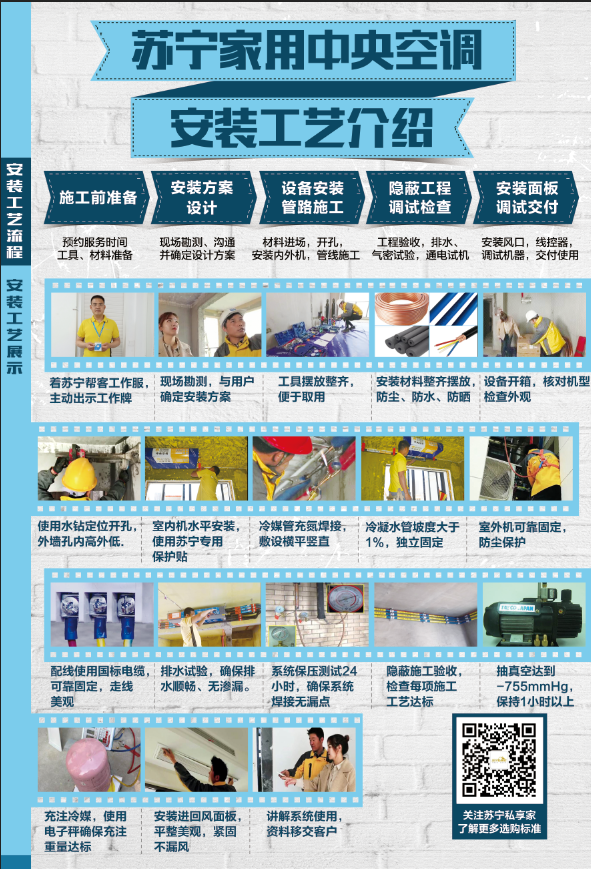 蘇寧中央空調(diào)以《安裝綠寶書》的形式,從“人、材、技”三方面規(guī)定蘇寧施工“365標準”,細致展示了蘇寧中央空調(diào)的施工流程和具體工藝,包括安裝工程師的職業(yè)行為、施工現(xiàn)場的規(guī)范、安裝工具的要求、安裝材料的標準,以及整個安裝過程的嚴苛工藝標準和調(diào)試環(huán)節(jié)等諸多方面。五大工序,涉及18個步驟,為消費者全面解讀中央空調(diào)標準化施工的“秘密”。