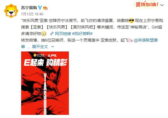 另?yè)?jù)蘇寧官方消息,7月11日~7月18日蘇寧冰爽節(jié)期間,除每千減百、百億補(bǔ)貼,蘇寧冰爽節(jié)亞索主題會(huì)場(chǎng)還為英雄聯(lián)盟玩家粉絲帶來(lái)了亞索新皮膚“靈魂蓮華”、風(fēng)扇等好物組成的“快樂(lè)大禮包”,用戶可通過(guò)下單購(gòu)物、微博互動(dòng)等方式獲取。