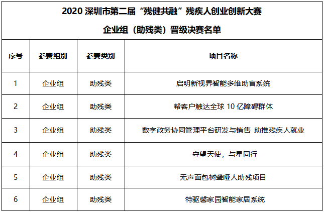 2020深圳市第二屆“殘健共融”殘疾人創(chuàng)業(yè)創(chuàng)新大賽企業(yè)組(助殘類)晉級決賽名單