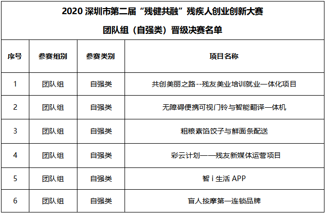2020深圳市第二屆“殘健共融”殘疾人創(chuàng)業(yè)創(chuàng)新大賽團隊組(自強類)晉級決賽名單