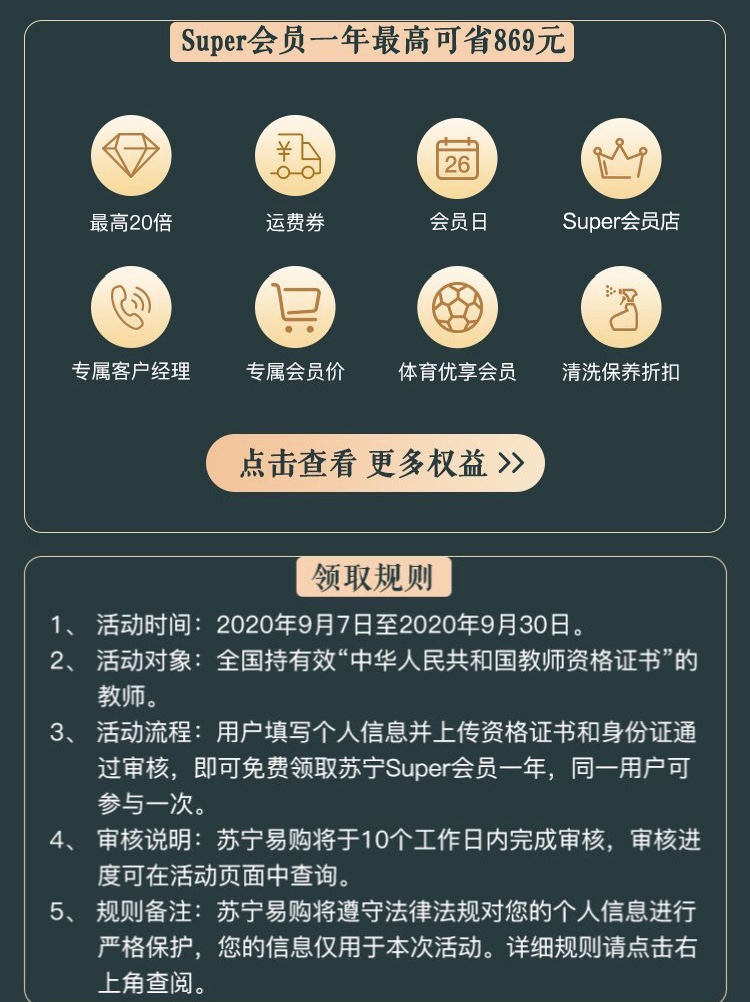 9月7至9月30日,凡持有效“中華人民共和國教師資格證書”的老師,在蘇寧易購AP P上搜索“教師”,進(jìn)入 Super會(huì)員領(lǐng)取頁面,填寫個(gè)人信息并上傳資格證書和身份證。通過審核后,即可免費(fèi)領(lǐng)取蘇寧Super會(huì)員年卡一張。