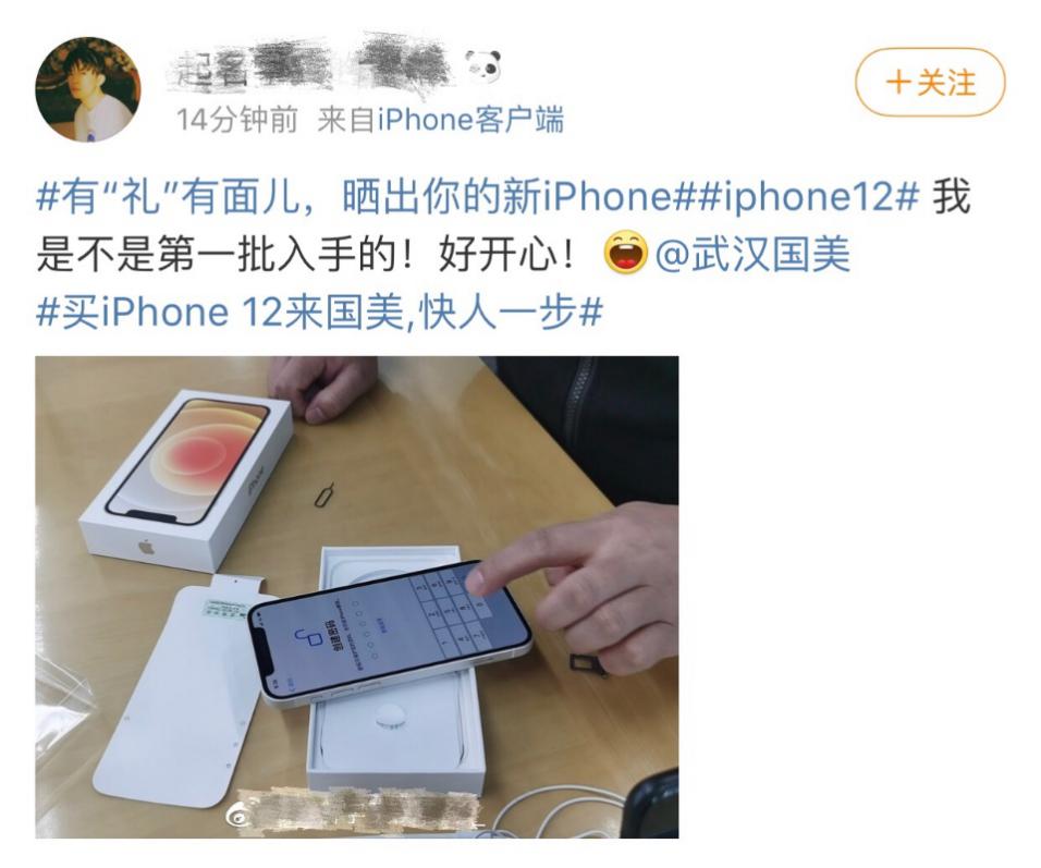還有“果粉”在收到國(guó)美閃電配送的iPhone12后,第一時(shí)間就微博曬新機(jī):“我是不是第一批入手的!好開(kāi)心!”還配上了一個(gè)張iPhone12拍出的新鮮出爐的大片。馬上就有跟帖說(shuō):“你就是微博今日最佳最靚的仔!”。