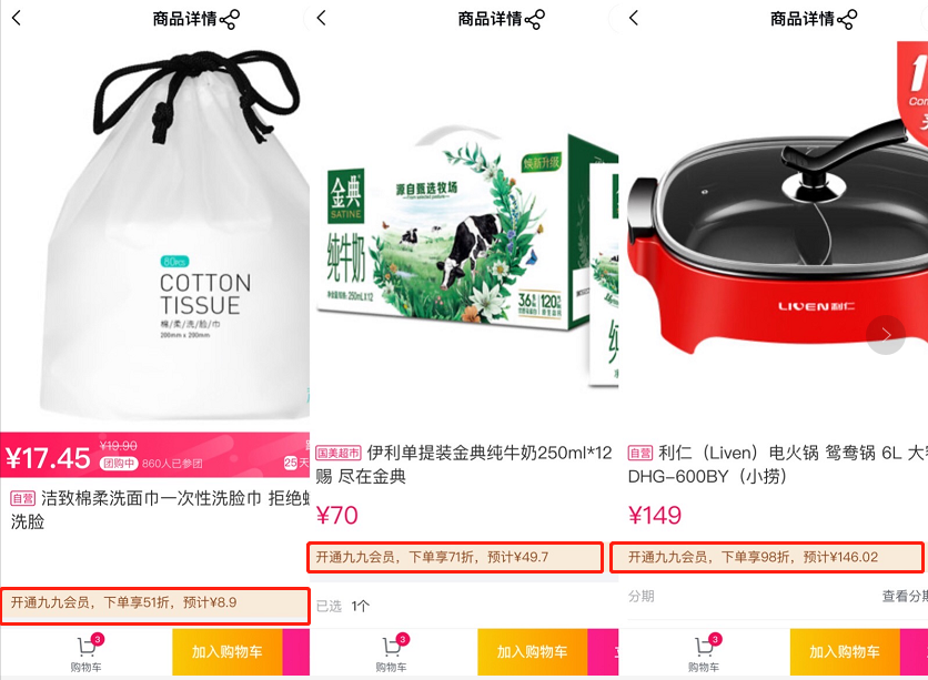 其中,原價19.9元的潔致綿柔洗臉巾只需8.9元即可到手,會員用戶在享受會員日常價基礎(chǔ)上,疊加享受5.1折;伊利金典純牛奶原價70元,九九會員可享受7.1折,49.7元就能到手;原價149元的利仁電火鍋,九九會員可享受9.8折,到手價146.02元。此外,部分小家電產(chǎn)品還可領(lǐng)取滿500減50、滿800減80等滿減優(yōu)惠券,享受折上折。