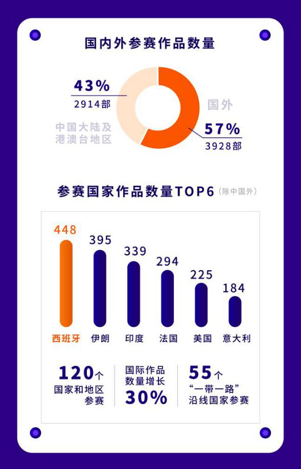 自今年9月中旬全球短片征集啟動以來,本屆短片節(jié)獲得來自世界各地創(chuàng)作者的積極響應(yīng),盡管受到新冠疫情影響以及遭遇影視產(chǎn)業(yè)寒冬,但本屆短片節(jié)參賽作品數(shù)量卻逆勢而上,并刷新歷史新高。而且,在今年的6842部參賽作品中,國際參賽作品多達3928部,數(shù)量較去年增長30%,占作品總量的57%。在今年參賽的120個國家和地區(qū)中,作品數(shù)量位居前六名的國家分別是西班牙(448部)、伊朗(395部)、印度(339部)、法國(294部)、美國(225部)和意大利(184部)。值得一提的是,作為深圳市參與“一帶一路”建設(shè)重點項目,短片節(jié)今年吸引了來自“一帶一路”沿線的55個國家參賽,約占目前65個“一帶一路”沿線國家數(shù)的85%,短片節(jié)作為推動“一帶一路”沿線國家間人文交流、促進全球跨文化傳播的重要平臺的作用日益凸顯,國際化進一步走向深入。