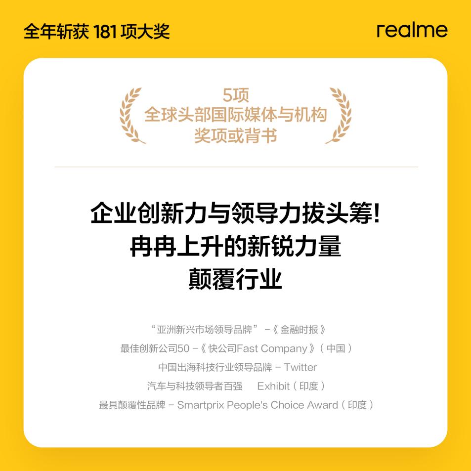 2020年,realme在全球斬獲了17個(gè)企業(yè)和品牌維度的獎(jiǎng)項(xiàng),企業(yè)創(chuàng)新力與領(lǐng)導(dǎo)力獲得業(yè)界認(rèn)可。國(guó)際權(quán)威媒體《金融時(shí)報(bào)》肯定了realme在亞太地區(qū)的領(lǐng)先地位。Financial Times、快公司、Twitter、Exhibi等媒體與機(jī)構(gòu)授予realme“亞洲新興市場(chǎng)領(lǐng)導(dǎo)品牌”、“最佳創(chuàng)新公司50”、“中國(guó)出??萍夹袠I(yè)領(lǐng)導(dǎo)品牌”、“汽車(chē)與科技領(lǐng)導(dǎo)者百?gòu)?qiáng)”以及“最具顛覆性品牌”五項(xiàng)大獎(jiǎng)。realme品牌潛力不斷釋放,業(yè)界普遍認(rèn)為,在過(guò)去的一年里,realme品牌的增勢(shì)強(qiáng)勁,全球品牌價(jià)值在不斷躍升。