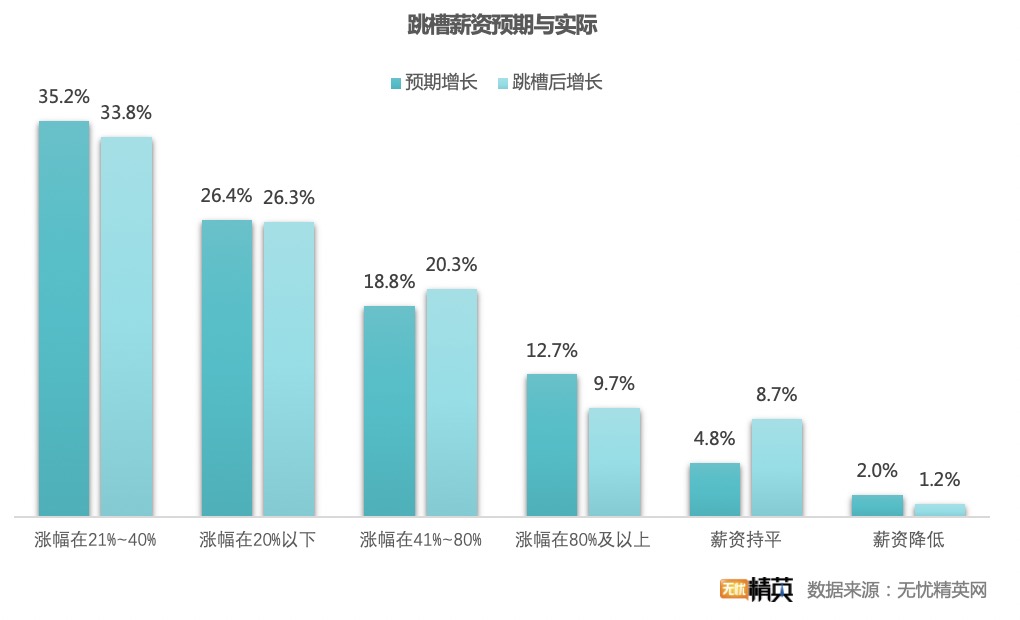 同時經(jīng)歷了一年的觀望、沉淀,職場精英在求職時不論是對工作城市、崗位還是薪資預(yù)期也更加理性。在兩組調(diào)研數(shù)據(jù)中,我們不難發(fā)現(xiàn)此次跳槽多數(shù)職場精英的薪資漲幅在21-40%之間,預(yù)期與實際增長之差僅有約3個百分點。這表明在職場精英對個人情況與行業(yè)崗位現(xiàn)狀做詳盡調(diào)查,預(yù)期管理科學合理。