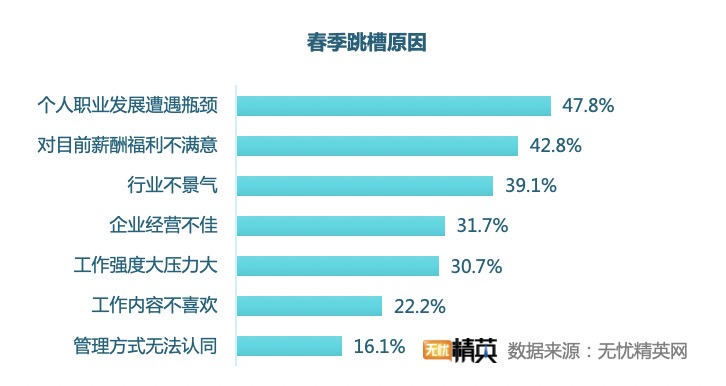 在此次調(diào)研中個人職業(yè)發(fā)展遭遇瓶頸、對薪酬福利不滿意依然如往年一般領(lǐng)跑,行業(yè)不景氣、企業(yè)發(fā)展不佳兩個選項緊隨其后。究其原因,還是在于部分行業(yè)與企業(yè)在經(jīng)歷疫情后實力受損恢復(fù)緩慢,員工失去了共同發(fā)展的信心,這也造成在此次跳槽調(diào)研中,職場精英更加青睞實力強勁的企業(yè)作為自己新的發(fā)展平臺。