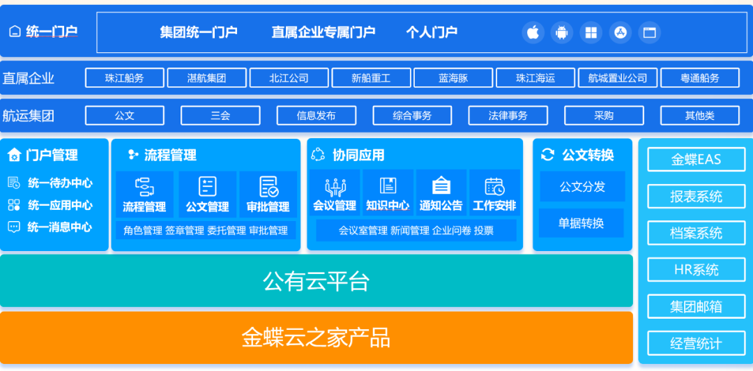作為大型綜合性國企,廣東航運(yùn)集團(tuán)現(xiàn)有直屬企業(yè)8家,擁有全資、控股、參股及代理水路客運(yùn)港口13家,經(jīng)營和管理96艘粵港澳高速客船。伴隨經(jīng)營規(guī)模的發(fā)展、技術(shù)迭代、應(yīng)用場景深入,其信息化需要一個(gè)可以覆蓋集團(tuán)協(xié)同應(yīng)用場景的綜合辦公平臺(tái),而集團(tuán)原有的OA已經(jīng)無法滿足航運(yùn)的持續(xù)發(fā)展需要。